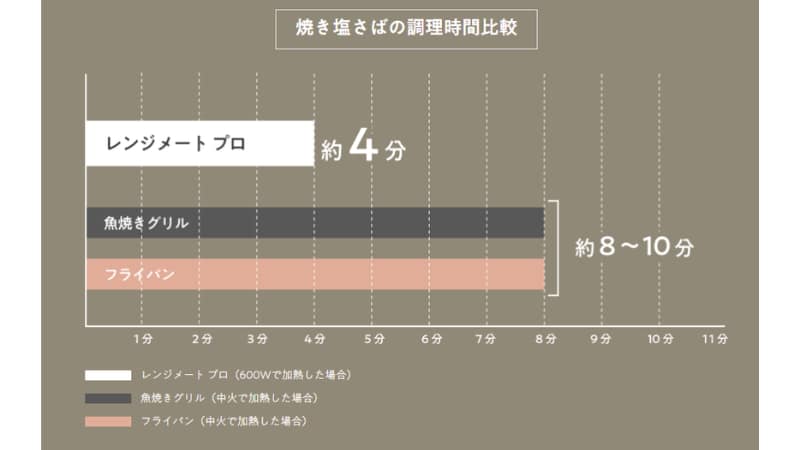 例えば焼きさばは魚焼きグリルやフライパンと比べて約半分の時間で調理できます。